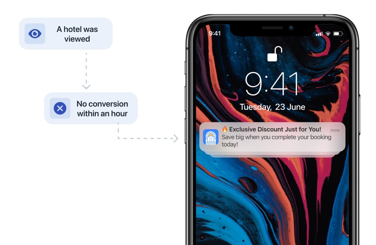 We offer a pre-built solution with tailored push notification scenarios. For example, if a hotel screen view doesn’t convert, a discount notification is sent an hour later, driving high CTRs.