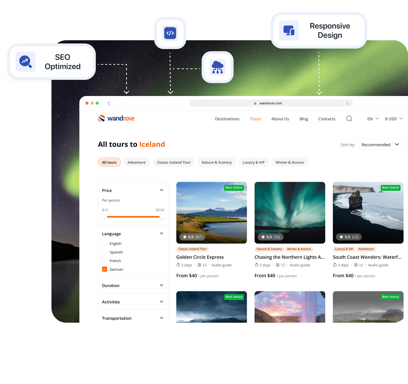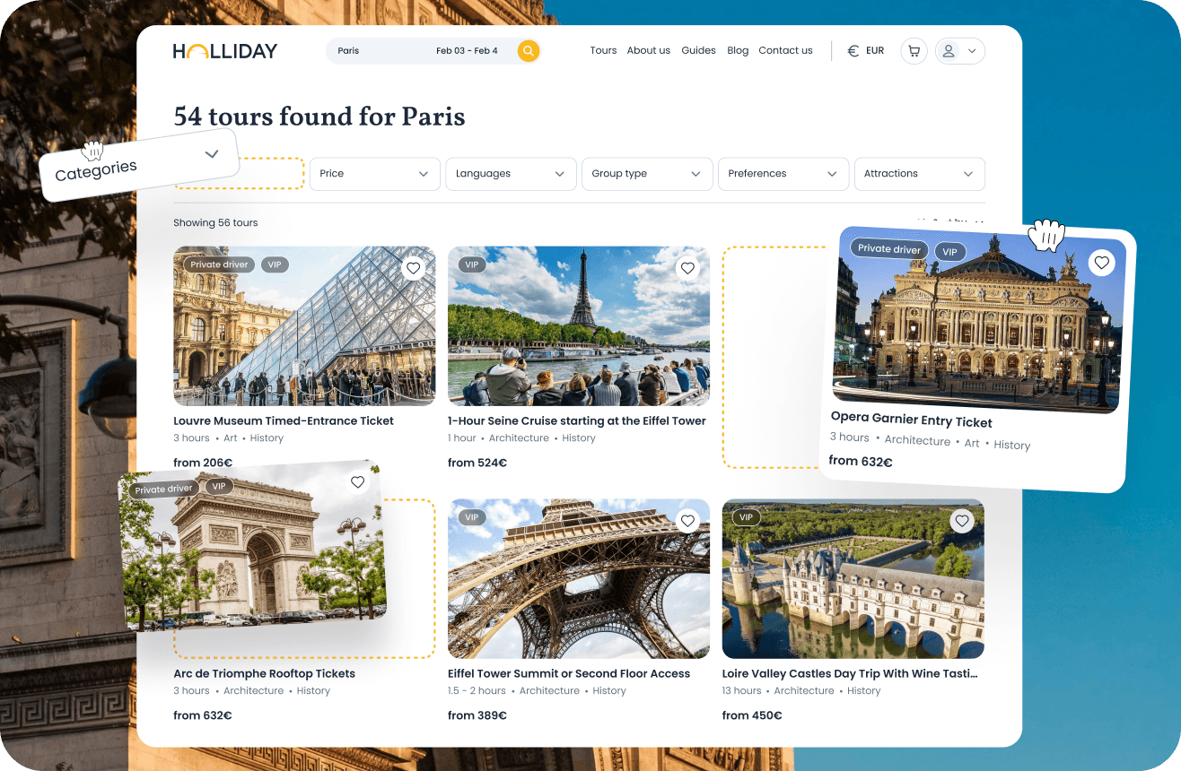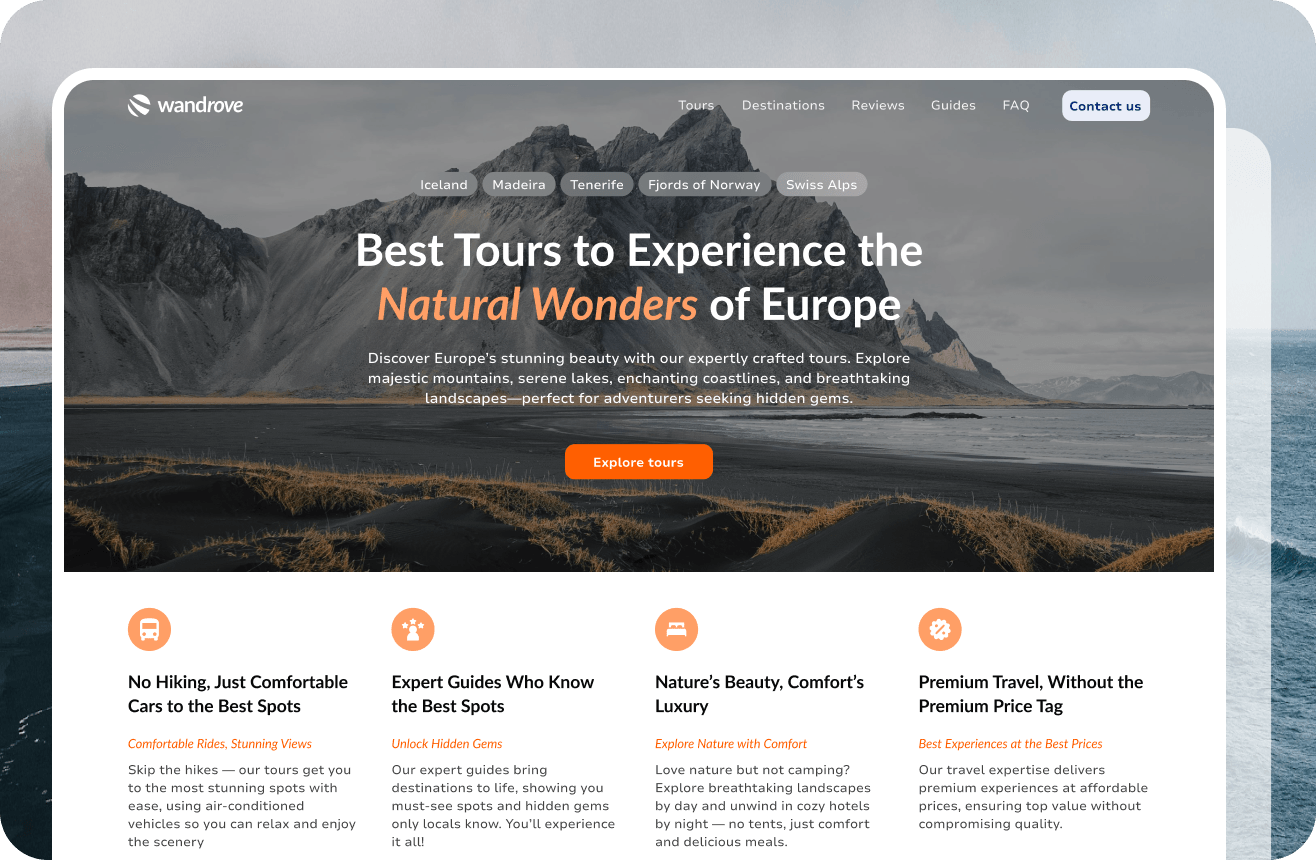 Base templates tailored for tours, activities, OTAs, and multi-day tours. Optimized for performance, SEO, and seamless user experiences to jumpstart your project.